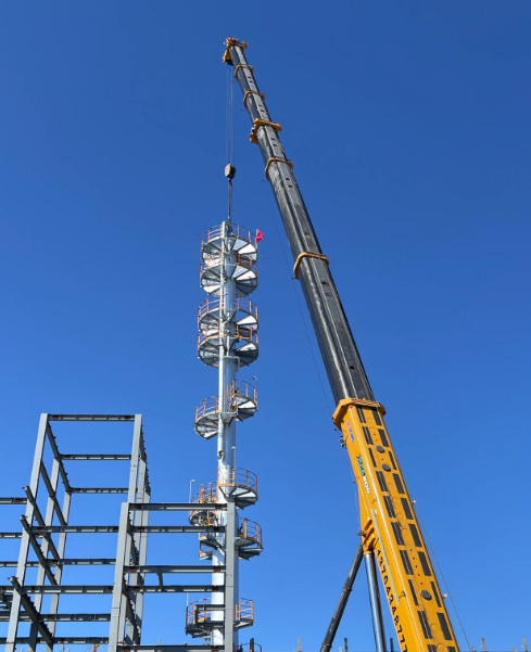 在此次吊裝任務(wù)中,特別值得一提的是,其中一臺溶劑精制塔(08100-C-2201)高達42.175米,重達47.55噸,成為整個順丁橡膠裝置中體積最大、高度最高的設(shè)備。另外兩臺塔器,溶劑精制塔(08100-C-1201)和丁二烯精制塔(08100-C-1301),也分別具有相當?shù)囊?guī)模和重量。這三臺塔器的吊裝工作,不僅是順丁橡膠裝置安裝的關(guān)鍵環(huán)節(jié),也是技術(shù)上的巨大挑戰(zhàn)。