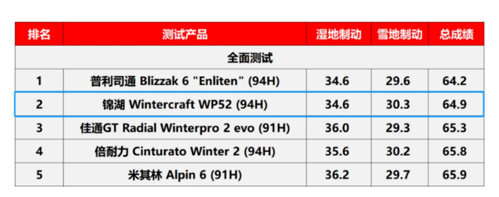 評測過程嚴格且全面,重點考察了兩項關鍵指標:一是在濕滑路面以80公里/小時速度行駛時的制動表現(xiàn),二是在雪地環(huán)境以50公里/小時速度下的剎車性能。錦湖輪胎Wintercraft WP52憑借其卓越的濕地制動距離34.6米及雪地制動距離30.3米,綜合評分位居第二。尤為值得一提的是,其在濕地制動性能上與普利司通的Blizzak 6“Enliten”并列首位,展現(xiàn)了非凡的技術實力。