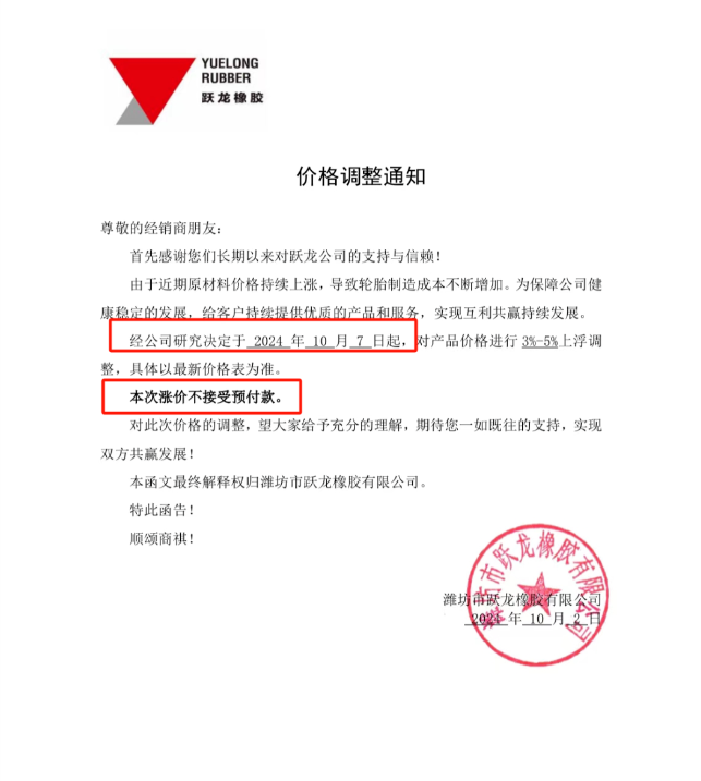 按照常規(guī)的市場邏輯,企業(yè)在發(fā)布漲價通知后,通常會給予經(jīng)銷商一定的備貨時間以應(yīng)對價格變動。然而,躍龍橡膠卻在此次漲價前采取了特殊措施。據(jù)悉,該公司在9月30日左右便提前通知了經(jīng)銷商,在10月1日至7日期間將暫停發(fā)貨。這一舉動實際上縮短了經(jīng)銷商的備貨時間,凸顯了躍龍橡膠此次漲價的決心和力度。