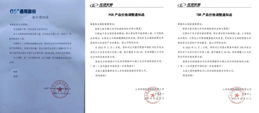 2024年10月15日,玲瓏輪胎接連發(fā)出兩張通知,宣布自11月起,其PCR及TBR產品將分別提價2%-3%。與此同時,通用股份也宣布自11月10日起半鋼產品價格也將上調2%-3%。漲價的主要驅動因素為成本上升,且據(jù)市場消息透露,部分輪胎工廠已口頭通知了第二輪漲價計劃。