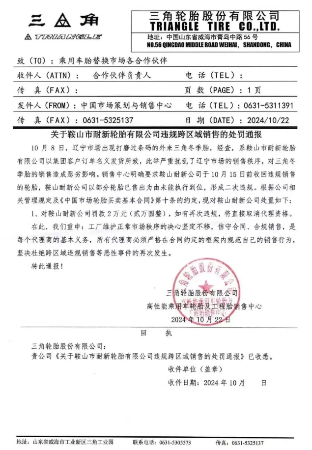 據(jù)炭黑產(chǎn)業(yè)網(wǎng)了解,依據(jù)公司相關(guān)管理規(guī)定以及《中國市場輪胎買賣基本合同》第十條的明確規(guī)定,三角輪胎最終決定對鞍山市耐新輪胎有限公司處以2萬元(人民幣貳萬元整)的罰款。同時(shí),公司方面還嚴(yán)正聲明,如若鞍山耐新公司再次發(fā)生類似違規(guī)行為,將立即取消其代理資格,以示警戒。