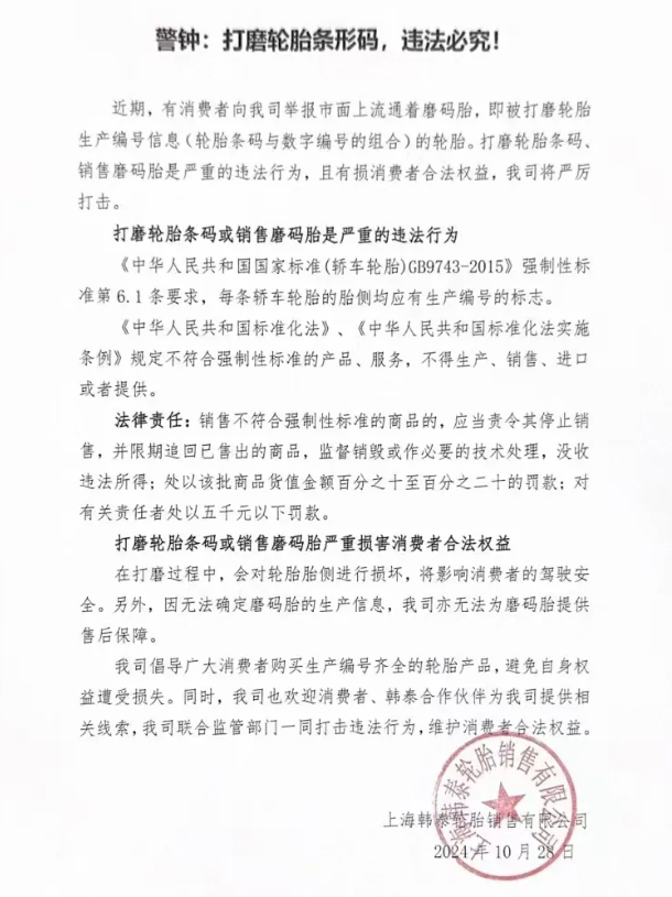 【炭黑產(chǎn)業(yè)網(wǎng)】10月31日消息,上海韓泰輪胎銷售有限公司近日發(fā)表聲明,嚴(yán)厲打擊磨標(biāo)胎行為。聲明中指出,有消費(fèi)者舉報(bào)市場(chǎng)上存在打磨輪胎條碼的違法行為。根據(jù)法規(guī),銷售不符合強(qiáng)制性標(biāo)準(zhǔn)的商品將被責(zé)令停止銷售,并限期追回已售出商品,監(jiān)督銷毀或進(jìn)行必要技術(shù)處理,同時(shí)還將面臨貨值金額10%至20%的罰款,相關(guān)責(zé)任人也會(huì)被處以最高五千元的罰款。目前,多家輪胎企業(yè)已聯(lián)合市場(chǎng)監(jiān)管部門,在全國范圍內(nèi)啟動(dòng)了磨標(biāo)胎的清查行動(dòng)。