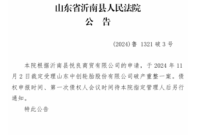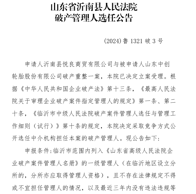 11月2日,山東省沂南縣人民法院對外發(fā)布了一則重要公告,宣布山東中創(chuàng)輪胎股份有限公司正式進入破產(chǎn)重整程序,并將通過公開選拔方式選任破產(chǎn)管理人,以促進該公司重整工作的順利進行。據(jù)了解,破產(chǎn)重整申請由沂南縣悅良商貿(mào)有限公司提出,理由是中創(chuàng)輪胎已無力償還到期債務,且公司資產(chǎn)無法覆蓋全部債務,盡管如此,公司仍具備重整的潛在價值。
