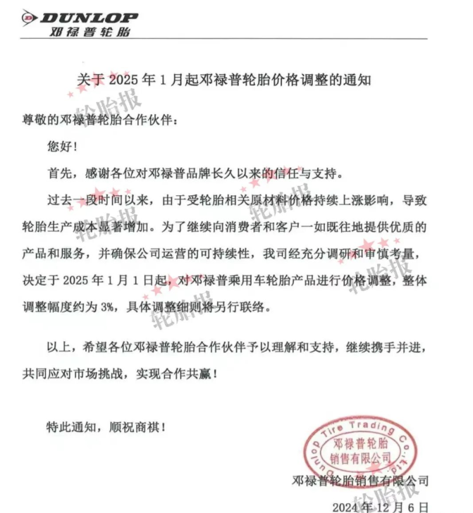 2025年1月1日起,全球知名輪胎制造商鄧祿普宣布,由于原材料價(jià)格持續(xù)上漲,其乘用車(chē)輪胎產(chǎn)品線(xiàn)將實(shí)施約3%的價(jià)格上調(diào)。