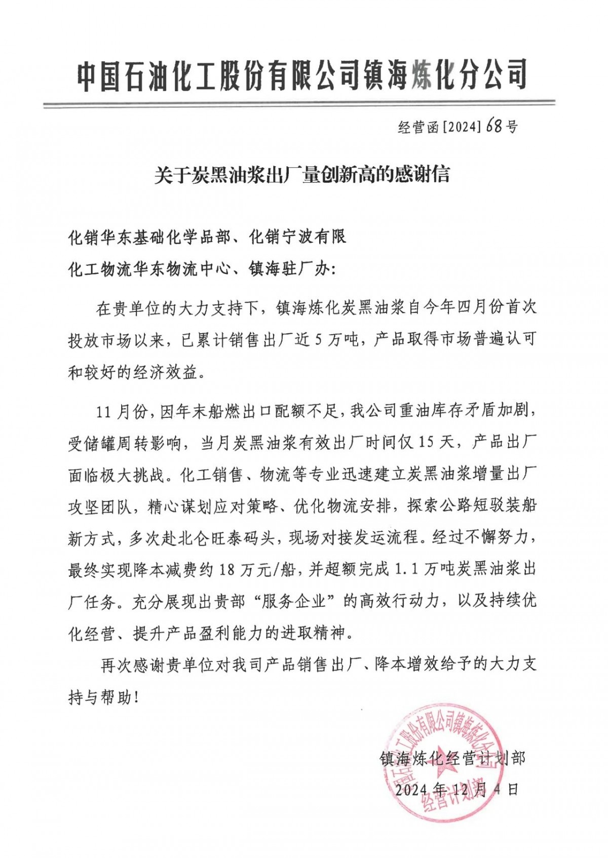【炭黑產(chǎn)業(yè)網(wǎng)】12月12日消息,中石化化工物流有限公司于15天內完成鎮(zhèn)海煉化1.1萬噸炭黑油漿出廠任務,實現(xiàn)降本減費約18萬元/船,緩解企業(yè)庫存壓力,解決產(chǎn)品出廠難題,喜獲企業(yè)感謝信!