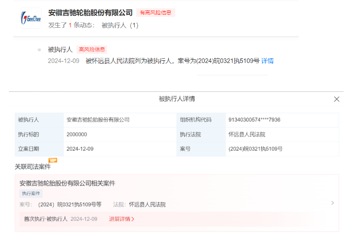 如今,安徽吉馳輪胎股份有限公司又面臨著被執(zhí)行人的困境,這可能會(huì)給公司的運(yùn)營(yíng)和發(fā)展帶來一些壓力。