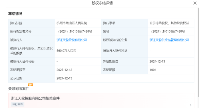 近日,杭州市蕭山區(qū)人民法院發(fā)布了一則重要公告,披露了浙江天輪控股有限公司(以下簡(jiǎn)稱“天輪控股”)所持股權(quán)被凍結(jié)的詳細(xì)信息。據(jù)悉,從2024年12月13日起,至2027年12月12日止,天輪控股在浙江天輪供應(yīng)鏈管理有限公司(以下簡(jiǎn)稱“天輪供應(yīng)鏈”)中的560萬(wàn)股權(quán)被依法凍結(jié)。