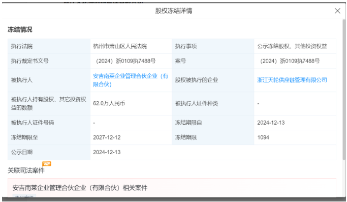 此次股權(quán)凍結(jié)的執(zhí)行對(duì)象為浙江天輪控股有限公司,而股權(quán)被執(zhí)行的企業(yè)則是其在供應(yīng)鏈領(lǐng)域的關(guān)聯(lián)公司——浙江天輪供應(yīng)鏈管理有限公司。被凍結(jié)的股權(quán)及其他投資權(quán)益數(shù)額巨大。此外,公告還顯示,安吉南萊企業(yè)管理合伙企業(yè)(有限合伙)(以下簡(jiǎn)稱“南萊企業(yè)”)同樣被列為被執(zhí)行人。從2024年12月13日至2027年12月12日,南萊企業(yè)在相關(guān)企業(yè)中持有的62.0萬(wàn)人民幣股權(quán)及其他投資權(quán)益也將被凍結(jié)。