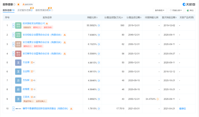 隨著此次股權(quán)凍結(jié)事件的曝光,天輪控股及其相關(guān)企業(yè)的股權(quán)結(jié)構(gòu)也浮出水面。據(jù)公開(kāi)資料顯示,杭州浙輪實(shí)業(yè)有限公司為天輪控股的第一大股東,持股比例高達(dá)55.569%。而安吉經(jīng)輪企業(yè)管理合伙企業(yè)(有限合伙)、安吉南萊企業(yè)管理合伙企業(yè)(有限合伙)以及安吉敏華企業(yè)管理合伙企業(yè)(有限合伙)則分別持有7.9385%、6.1523%和5.5569%的股份。