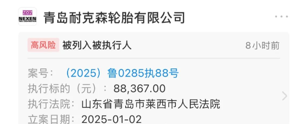 【炭黑產(chǎn)業(yè)網(wǎng)】1月3日消息,近日,青島耐克森輪胎有限公司因法律糾紛問題,被山東省青島市萊西市人民法院納入被執(zhí)行人名單,案號(hào)顯示為(2025)魯0285執(zhí)88號(hào),執(zhí)行標(biāo)的金額達(dá)88367元,且該案件于2025年1月2日正式立案。耐克森,這一源自韓國的輪胎制造品牌,在國內(nèi)的產(chǎn)品大多出自青島工廠。