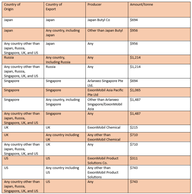 資料顯示,RSE是印度HIIR的唯一生產(chǎn)商,自2021年2月開始生產(chǎn)該材料,并于2023年3月31日正式實現(xiàn)商業(yè)生產(chǎn)。本次調(diào)查涉及的鹵化丁基橡膠包括溴化丁基橡膠(BIIR)和氯化丁基橡膠(CIIR),這些橡膠是通過IIR的異戊二烯基團鹵化而制得,廣泛應(yīng)用于輪胎氣密層、軟管、密封件、薄膜、油箱襯里和傳送帶等領(lǐng)域。