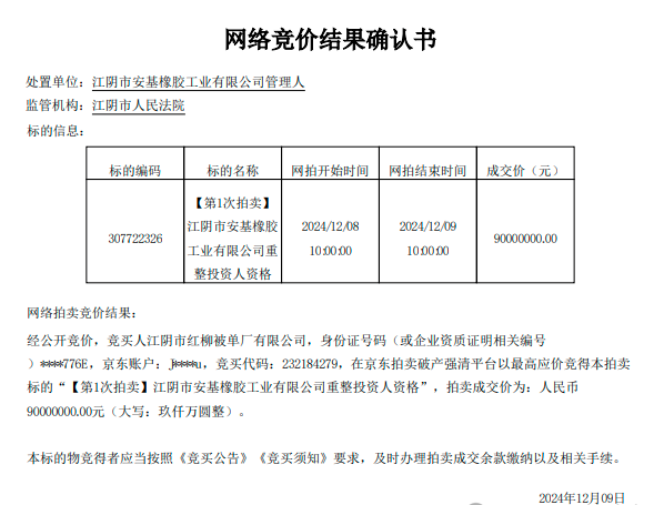 【炭黑產(chǎn)業(yè)網(wǎng)】1月14日消息,近日,江陰市安基橡膠工業(yè)有限公司的破產(chǎn)重整案迎來(lái)了突破性進(jìn)展。據(jù)悉,2024年12月27日,法院根據(jù)管理人的申請(qǐng),依照《中華人民共和國(guó)企業(yè)破產(chǎn)法》相關(guān)規(guī)定,正式裁定批準(zhǔn)了該公司的重整計(jì)劃,并宣告其重整程序終止。與此同時(shí),京東拍賣平臺(tái)發(fā)布了相關(guān)的資產(chǎn)重整信息,公開(kāi)招募投資人。最終,江陰市紅柳被單廠有限公司以9000萬(wàn)元的價(jià)格成功競(jìng)得投資人資格,至此,該公司不僅成為了安基橡膠的重整投資人,還獲得了其100%的股權(quán)。