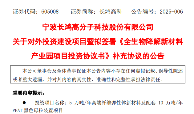 【炭黑產(chǎn)業(yè)網(wǎng)】1月16日消息,寧波長鴻高分子科技股份有限公司已與嵊州市人民政府簽署了《全生物降解新材料產(chǎn)業(yè)園項目投資協(xié)議書》的補充協(xié)議。根據(jù)協(xié)議,寧波長鴻高分子科技股份有限公司將在原有投資計劃的基礎(chǔ)上,新增建設(shè)年產(chǎn)5萬噸高端纖維彈性體新材料和年產(chǎn)10萬噸PBAT黑色母粒產(chǎn)線項目。