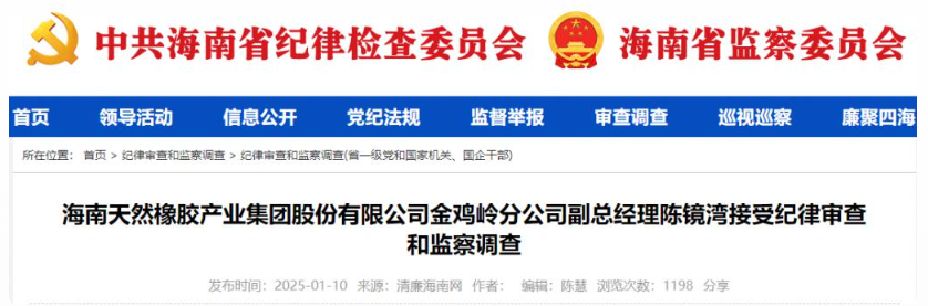 【炭黑產(chǎn)業(yè)網(wǎng)】1月21日消息,近日,海南省紀(jì)委監(jiān)委網(wǎng)站發(fā)布消息,指出海南橡膠金雞嶺分公司副總經(jīng)理陳鏡灣涉嫌嚴(yán)重違紀(jì)違法,目前正接受保亭縣紀(jì)委監(jiān)委的紀(jì)律審查和監(jiān)察調(diào)查。海南橡膠作為業(yè)界矚目的企業(yè),其地位不容忽視。