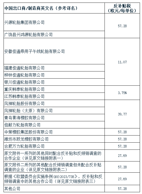 【炭黑產(chǎn)業(yè)網(wǎng)】1月23日消息,近日,歐盟委員會(huì)發(fā)布了一項(xiàng)重要公告,宣布對(duì)來自中國的全新及翻新卡客車輪胎的第一次反補(bǔ)貼日落復(fù)審作出了最終裁決。裁決結(jié)果維持了對(duì)中國相關(guān)產(chǎn)品的反補(bǔ)貼稅征收,稅率區(qū)間定為每單位3.75歐元至57.28歐元,具體稅率細(xì)節(jié)可參考相關(guān)表格。此次涉案產(chǎn)品的歐盟CN編碼為4011 20 90和4012 12 00(對(duì)應(yīng)的TARIC編碼為4012 12 00 10)。