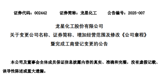 據(jù)悉,該公司中文名稱已從“龍星化工股份有限公司”變更為“龍星科技集團(tuán)股份有限公司”。與此同時(shí),其英文名稱也由“LONGXING CHEMICAL STOCK CO., LTD.”更新為“Longxing Technology Group Co.,Ltd.”。其證券簡(jiǎn)稱也同步由“龍星化工”變更為“龍星科技”,英文簡(jiǎn)稱則由“LXCIC”變更為“LXTG”。值得注意的是,公司證券代碼“002442”在此次更名中保持不變。以上調(diào)整,已于2025年1月24日正式啟用。