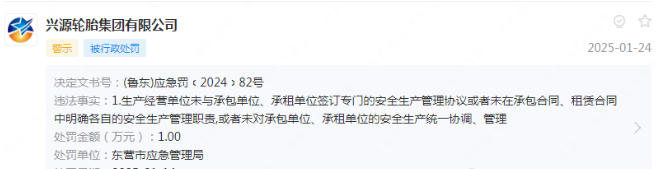 近日,興源輪胎集團(tuán)有限公司被東營市應(yīng)急管理局處以10000元人民幣的罰款。