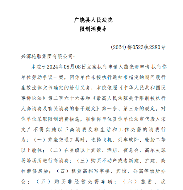 據(jù)了解,興源輪胎集團(tuán)有限公司未與承包單位、承租單位簽訂專門的安全生產(chǎn)管理協(xié)議,也未在承包合同、租賃合同中明確各自的安全生產(chǎn)管理職責(zé),同時未對承包單位、承租單位的安全生產(chǎn)進(jìn)行統(tǒng)一協(xié)調(diào)、管理。根據(jù)《中華人民共和國安全生產(chǎn)法》第四十九條第二款的規(guī)定,生產(chǎn)經(jīng)營單位應(yīng)當(dāng)與承包單位、承租單位簽訂專門的安全生產(chǎn)管理協(xié)議,或者在合同中明確各自的安全生產(chǎn)管理職責(zé)。興源輪胎集團(tuán)有限公司的違法行為屬于《中華人民共和國安全生產(chǎn)法》第一百零三條第二款所規(guī)定的處罰范疇,因此被處以10000元人民幣罰款。2024年12月,廣饒縣人民法院針對興源輪胎集團(tuán)有限公司(以下簡稱興源輪胎”)及其法定代表人宋文廣發(fā)布了限制消費令,案號為(2024)魯0523執(zhí)2280號。