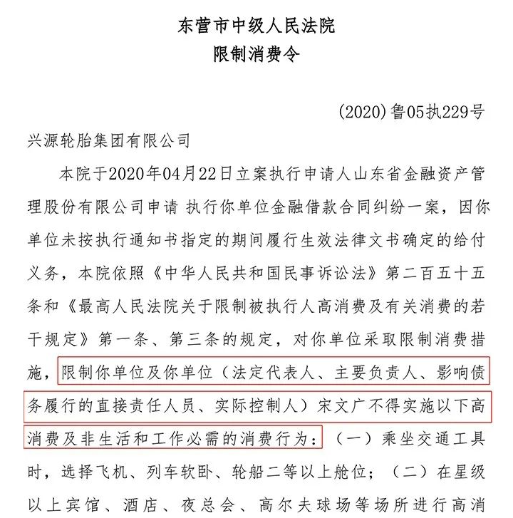 早在2020年4月27日,東營市中級人民法院發(fā)布了一條公告,2020年4月22日山東金融資產(chǎn)管理有限公司申請執(zhí)行星園集團(tuán)金融借款合同一案,興源集團(tuán)總經(jīng)理法定代表人被限制高消費。包括乘坐交通工具、住酒店、購買樓房、租賃場所、子女讀私立高收費學(xué)校等等。