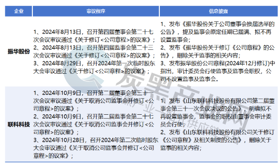 振華股份選擇在其董事會、監(jiān)事會及股東大會中審議修訂公司章程的議案,并未單獨提出取消監(jiān)事會的議案;相比之下,聯(lián)科科技則明確將取消監(jiān)事會的議案納入了審議范圍。在信息披露層面,振華股份僅在董事會換屆選舉公告中簡要提及了不再設(shè)置監(jiān)事會的決定,而聯(lián)科科技則在董事會決議公告中明確宣布了取消監(jiān)事會,并將監(jiān)事會職權(quán)轉(zhuǎn)由審計委員會行使。