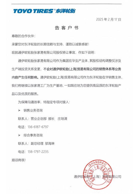 通伊歐輪胎上海貿(mào)易公司隨后發(fā)出了關(guān)于張家港公司股權(quán)轉(zhuǎn)讓事宜的告知書。告知書表示,通伊歐輪胎張家港有限公司作為集團(tuán)在華生產(chǎn)主體,其股權(quán)結(jié)構(gòu)調(diào)整僅涉及生產(chǎn)端投資關(guān)系變更,不會(huì)對通伊歐輪胎(上海)貿(mào)易有限公司的銷售體系等業(yè)務(wù)內(nèi)容產(chǎn)生任何影響。