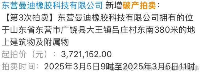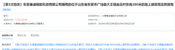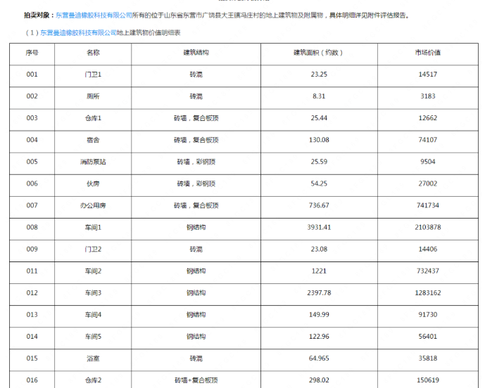 東營(yíng)曼迪橡膠科技有限公司,一家專注于力車胎生產(chǎn)的企業(yè),因重整失敗,再次將其位于山東省東營(yíng)市廣饒縣大王鎮(zhèn)的廠房及附屬物推向市場(chǎng)。