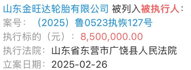2025年2月26日,我國輪胎行業(yè)傳來一則重磅消息,山東金旺達(dá)輪胎有限公司因金融借款合同糾紛被山東省東營市廣饒縣人民法院列入被執(zhí)行人名單,執(zhí)行標(biāo)的高達(dá)850萬元。