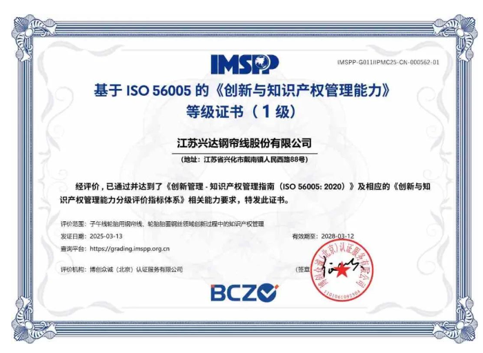 【炭黑產(chǎn)業(yè)網(wǎng)】3月15日消息,江蘇興達鋼簾線股份有限公司(以下簡稱“江蘇興達”)近日喜獲佳訊,經(jīng)過博創(chuàng)眾誠認(rèn)證服務(wù)有限公司的嚴(yán)格評審,該公司榮獲了ISO 56005“創(chuàng)新與知識產(chǎn)權(quán)管理能力證書”。這一榮譽使江蘇興達成為泰州市首家通過創(chuàng)新與知識產(chǎn)權(quán)管理能力分級評價的企業(yè),彰顯了其在知識產(chǎn)權(quán)管理和創(chuàng)新方面的卓越實力。