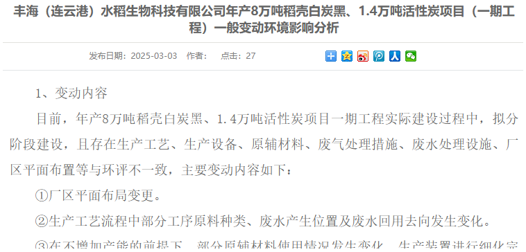 【炭黑產(chǎn)業(yè)網(wǎng)】3月24日消息,豐海(連云港)水稻生物科技有限公司宣布對其年產(chǎn)8萬噸稻殼白炭黑及1.4萬噸活性炭項目實施方案進(jìn)行調(diào)整。