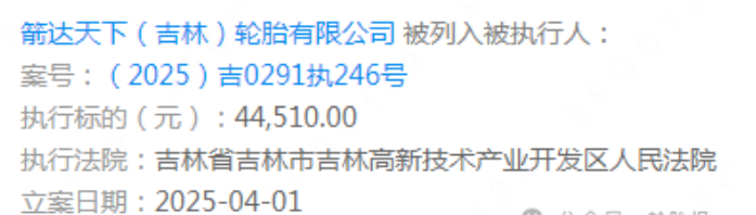 據(jù)法院發(fā)布的執(zhí)行信息顯示,箭達(dá)天下(吉林)輪胎有限公司的證件號(hào)/組織機(jī)構(gòu)代碼為91220200MADFKWJ28C,執(zhí)行案號(hào)為(2025)吉0291執(zhí)246號(hào)。目前,疑似申請(qǐng)執(zhí)行人信息尚未明確。此次被執(zhí)行事件無疑給該公司的發(fā)展帶來了一定的挑戰(zhàn)。