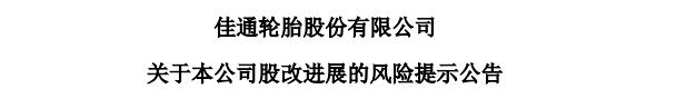 S佳通發(fā)布股改進展風險提示:進展緩慢,投資者需謹慎 2025年3月29日,佳通輪胎股份有限公司(證券代碼:600182,證券簡稱:S佳通)發(fā)布了關于本公司股改進展的風險提示公告。