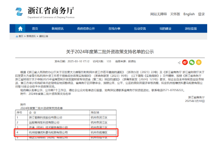 喜訊!杭州優(yōu)科豪馬輪胎入選浙2024年第二批外資扶持企業(yè)