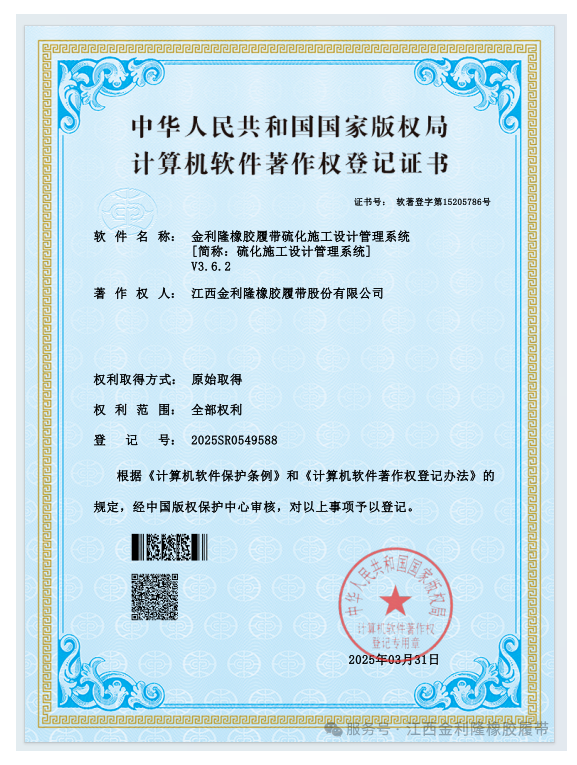 【炭黑產(chǎn)業(yè)網(wǎng)】4月12日消息,江西金利隆橡膠履帶股份有限公司近日迎來(lái)喜訊,其自主研發(fā)的《硫化施工設(shè)計(jì)管理系統(tǒng)V3.6.2》成功獲得國(guó)家版權(quán)局頒發(fā)的計(jì)算機(jī)軟件著作權(quán)登記證書(shū)。這一創(chuàng)新成果由公司技術(shù)研發(fā)中心的產(chǎn)品設(shè)計(jì)專家吳龍飛領(lǐng)銜開(kāi)發(fā),標(biāo)志著金利隆在橡膠履帶硫化施工設(shè)計(jì)領(lǐng)域邁出了堅(jiān)實(shí)的一步。