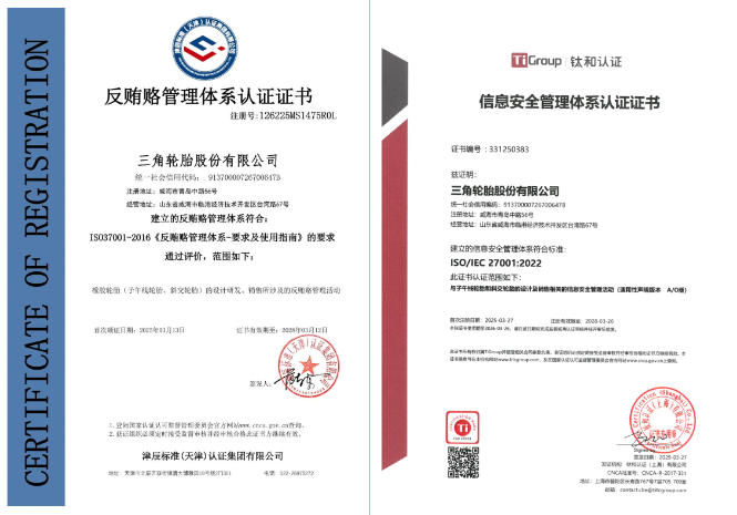 【炭黑產(chǎn)業(yè)網(wǎng)】4月14日消息,近日,三角輪胎股份有限公司正式宣布,公司已順利通過ISO 27001信息安全管理體系認(rèn)證及ISO 37001反賄賂管理體系認(rèn)證,這一里程碑式的成就標(biāo)志著其在信息安全與商業(yè)合規(guī)領(lǐng)域?qū)崿F(xiàn)了質(zhì)的飛躍。兩大國際認(rèn)證的獲得,不僅是對公司長期以來堅持規(guī)范化管理、強化風(fēng)險防控能力的權(quán)威認(rèn)可,更為其未來的可持續(xù)發(fā)展奠定了堅實基礎(chǔ)。