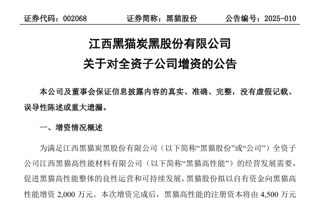 此次增資規(guī)模達(dá) 2000 萬元,增資完成后,黑貓高性能的注冊(cè)資本將從原有的 4500 萬元提升至 6500 萬元,公司仍將保持對(duì)該子公司的全資控股地位。