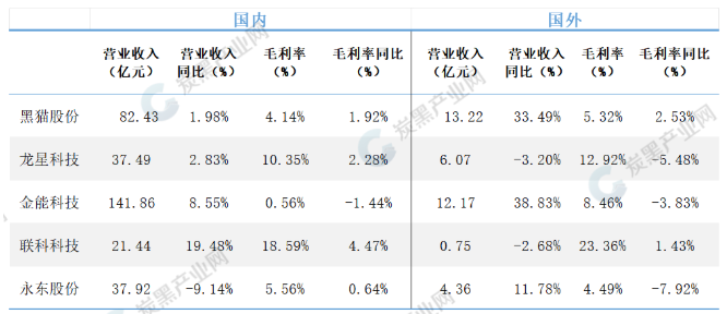 從2024年來看,五家上市企業(yè)的業(yè)務(wù)主要為國內(nèi)市場,占比高達(dá)8-9成,海外市場占比較小,占比不超過2成。從2024年來看,黑貓、金能及永東的海外營收實現(xiàn)較快的增長。