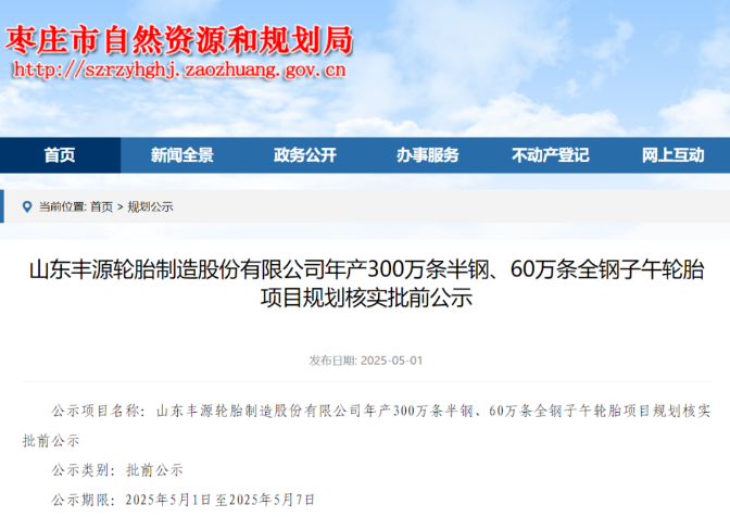 【炭黑產(chǎn)業(yè)網(wǎng)】5 月 7 日消息,近日,山東豐源輪胎制造股份有限公司迎來(lái)重要進(jìn)展。山東省棗莊市自然資源和規(guī)劃局于 5 月 1 日對(duì)外發(fā)布公示,對(duì)豐源輪胎年產(chǎn) 300 萬(wàn)條半鋼、60 萬(wàn)條全鋼子午輪胎項(xiàng)目開展規(guī)劃核實(shí)批前公示,此次公示將持續(xù)至 5 月 7 日結(jié)束。