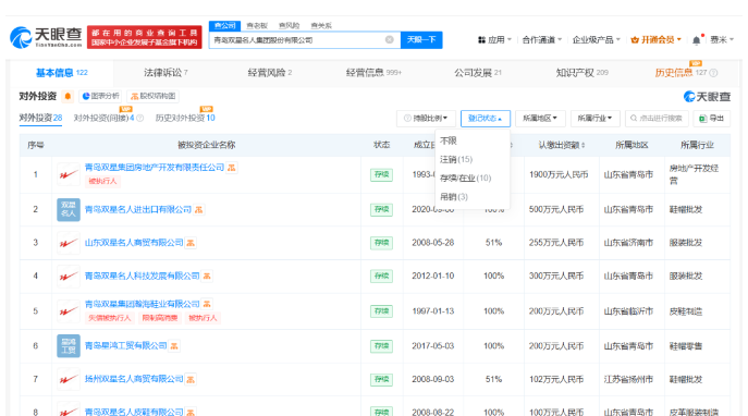 據(jù)炭黑產(chǎn)業(yè)網(wǎng)了解,青島雙星名人集團股份有限公司成立于 2002 年 9 月,法定代表人為汪海,注冊資本約 1.01 億人民幣,業(yè)務(wù)涵蓋橡膠制品制造、勞保鞋及勞動保護用品的生產(chǎn)銷售、自有資金對外投資等領(lǐng)域,由青島星邁達工貿(mào)有限公司、汪海、山東王道商貿(mào)有限公司等共同持股。從對外投資信息來看,該公司對外投資 28 家企業(yè),其中 18 家處于注銷或吊銷狀態(tài),僅 10 家為存續(xù)或開業(yè)狀態(tài),像青島雙星集團房地產(chǎn)開發(fā)有限責任公司、青島雙星名人進出口有限公司等便在開業(yè)之列。而汪海關(guān)聯(lián)企業(yè)共有 8 家,其中 5 家已注銷或吊銷,剩余 3 家為開業(yè)狀態(tài),包括青島雙星名人集團股份有限公司、青島雙星名人進出口有限公司、青島名人海工貿(mào)有限公司 。