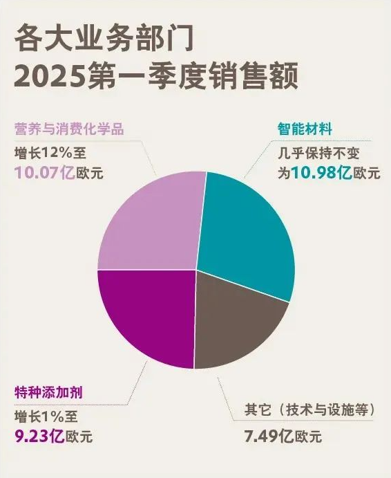 智能材料業(yè)務(wù)部門銷售額同比幾乎持平,為10.98億歐元,銷量和銷售價(jià)格與去年同期基本一致。無(wú)機(jī)產(chǎn)品整體需求略有增加,銷售價(jià)格穩(wěn)定,但貴金屬價(jià)格下降使銷售額略有減少;聚合物業(yè)務(wù)因銷量增加和價(jià)格略有改善,銷售額有所增長(zhǎng)。該業(yè)務(wù)部門調(diào)整后的EBITDA為1.49億歐元,較去年同期下降7%(去年同期的調(diào)整后EBITDA包括許可收入),調(diào)整后的EBITDA利潤(rùn)率從去年同期的14.6%降至13.6%。