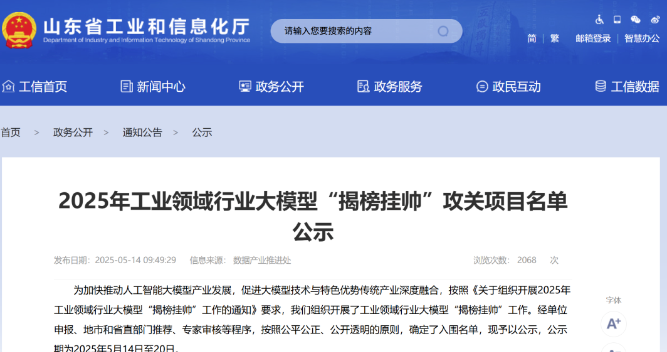 5月14日,山東省工業(yè)和信息化廳對(duì)2025年工業(yè)領(lǐng)域行業(yè)大模型“揭榜掛帥”攻關(guān)項(xiàng)目名單進(jìn)行公示。