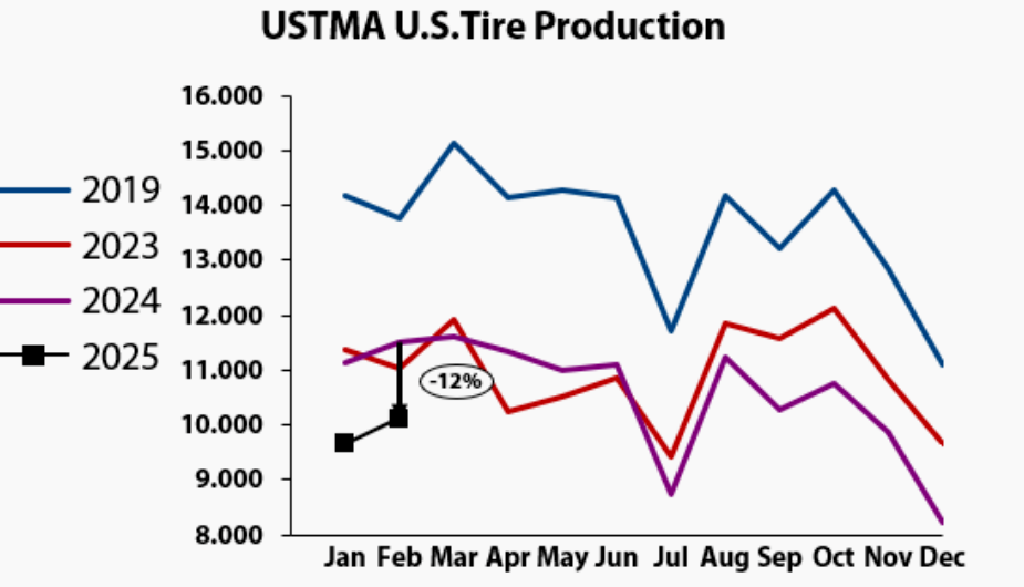 從歐勵(lì)隆提供的數(shù)據(jù)來(lái)看,美國(guó)輪胎產(chǎn)量在第一季度前兩個(gè)月下降了 12%,且仍大幅低于 COVID - 19 之前的水平。