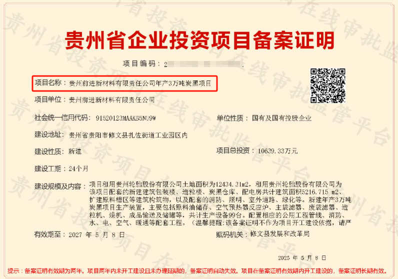 【炭黑產(chǎn)業(yè)網(wǎng)】5 月 29日消息,近日,貴州前進新材料有限責任公司年產(chǎn)3萬噸炭黑項目,順利完成備案。