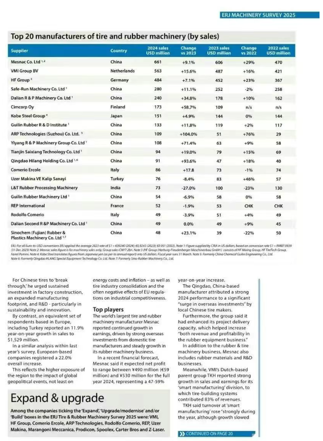 【炭黑產(chǎn)業(yè)網(wǎng)】6月3日消息,近日,全球橡膠機(jī)械行業(yè)迎來年度重磅排名,歐洲橡膠雜志(ERJ)正式公布2024年全球橡膠機(jī)械企業(yè)銷售收入榜單。在這份備受矚目的榜單中,軟控股份有限公司(MESNAC)憑借卓越表現(xiàn),連續(xù)三年蟬聯(lián)榜首,再次鞏固了其在全球橡膠機(jī)械領(lǐng)域的領(lǐng)軍地位。