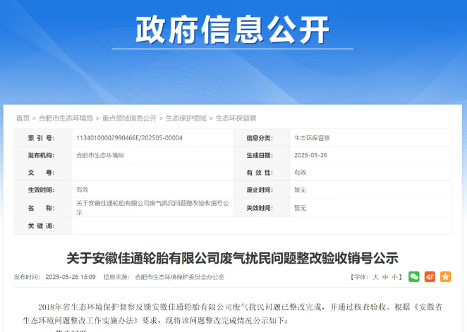 【炭黑產(chǎn)業(yè)網(wǎng)】6月4日消息,在環(huán)保攻堅的道路上,合肥市又傳來一則令人振奮的消息:曾長期困擾周邊居民的安徽佳通乘用子午線輪胎有限公司(原安徽佳通輪胎有限公司)廢氣擾民問題,終于迎來了圓滿解決的時刻。合肥市生態(tài)環(huán)境局正式發(fā)布公示,宣布該問題整改工作已完成并通過驗收,為這一持續(xù)多年的環(huán)保難題畫上了句號。