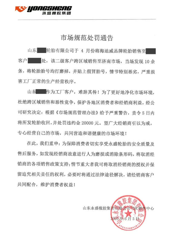 近日,永盛橡膠集團(tuán)TBR銷售中心發(fā)布市場(chǎng)規(guī)范處罰通告,對(duì)山東某輪胎公司磨換胎號(hào)、跨區(qū)域銷售等行為嚴(yán)重警告,責(zé)令其5日內(nèi)收回跨區(qū)域銷售輪胎,并處罰違約金20000元。