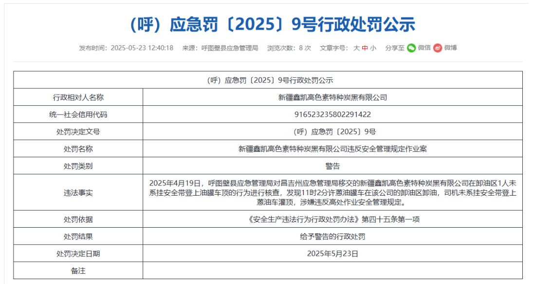 據(jù)了解,2025年4月19日,呼圖壁縣應(yīng)急管理局對昌吉州應(yīng)急管理局移交的新疆鑫凱高色素特種炭黑有限公司在卸油區(qū)1人未系掛安全帶登上油罐車頂?shù)男袨檫M行核查,發(fā)現(xiàn)11時2分許蒽油罐車在該公司的卸油區(qū)卸油,司機未系掛安全帶登上蒽油車灌頂,這一行為明顯違反了高處作業(yè)的安全管理規(guī)定。