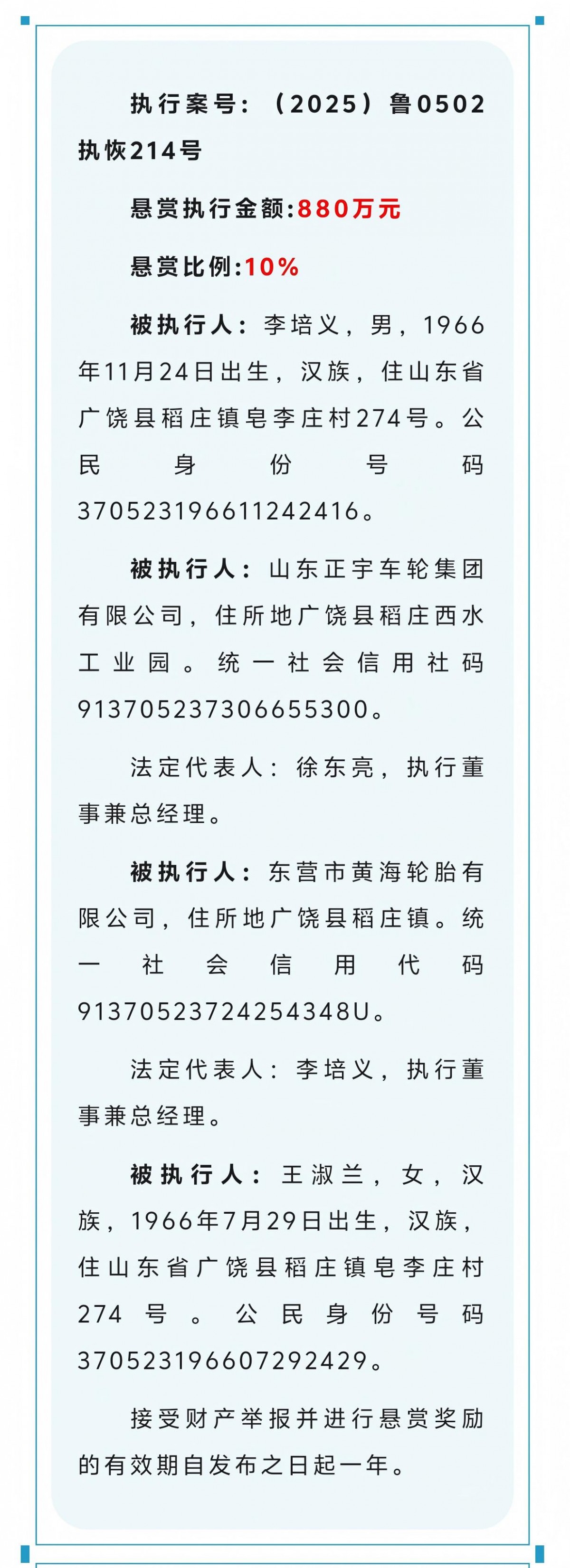 【炭黑產(chǎn)業(yè)網(wǎng)】6月16日消息,近日,東營市東營區(qū)人民法院對外公布了一則懸賞公告,懸賞總金額高達(dá)880萬元,引發(fā)社會廣泛關(guān)注。此次懸賞公告涉及的主體為山東正宇車輪集團(tuán)有限公司以及東營市黃海輪胎有限公司。公告指出,接受財(cái)產(chǎn)舉報(bào)并進(jìn)行懸賞獎(jiǎng)勵(lì)。