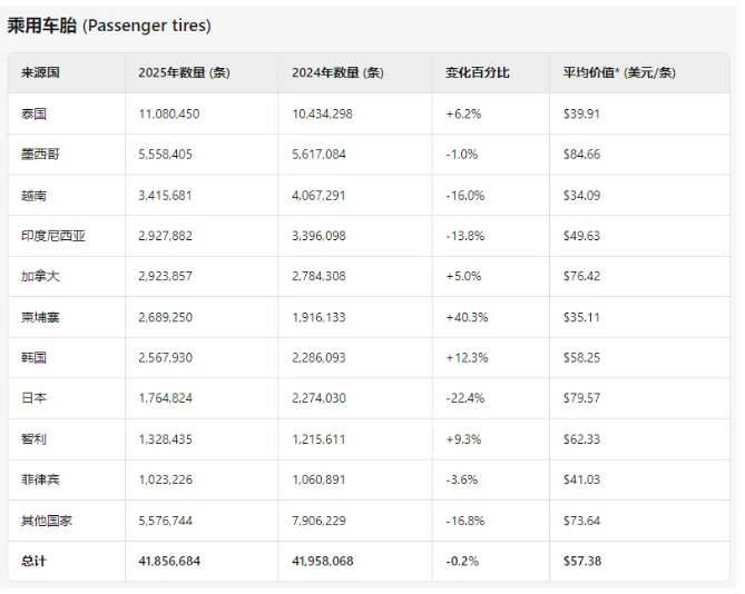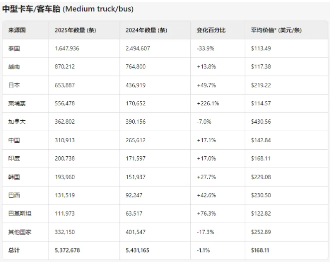 在輕卡輪胎市場,情況則截然不同。受益于柬埔寨和塞爾維亞輪胎制造商的積極表現(xiàn),美國一季度輕卡輪胎進(jìn)口量增長了4.2%,達(dá)到1010萬條。柬埔寨憑借54.2%的同比增長率,成功躋身該類別第三大供應(yīng)商。此外,泰國和墨西哥也實(shí)現(xiàn)了不同程度的增長,而越南和加拿大的進(jìn)口量則有所下降。塞爾維亞輪胎進(jìn)口量更是暴增151.5%,主要得益于東洋輪胎和玲瓏輪胎在當(dāng)?shù)氐墓S推動(dòng)。