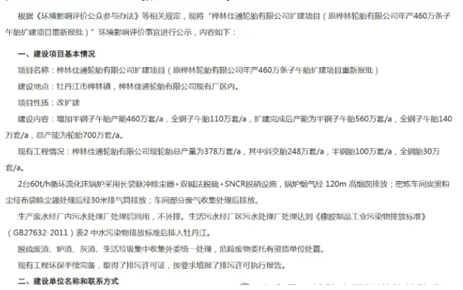 【炭黑產(chǎn)業(yè)網(wǎng)】6月30日消息,近日,牡丹江市陽(yáng)明生態(tài)環(huán)境局發(fā)布的一紙環(huán)評(píng)公示,為樺林佳通輪胎有限公司的未來(lái)發(fā)展揭開(kāi)了新篇章。這家在東北工業(yè)版圖中占據(jù)重要地位的老牌企業(yè),即將通過(guò)技術(shù)革新與產(chǎn)能擴(kuò)張,實(shí)現(xiàn)從傳統(tǒng)制造向智能制造的華麗轉(zhuǎn)身。此次擴(kuò)建項(xiàng)目不僅將顯著提升企業(yè)的生產(chǎn)能力,更有望重塑黑龍江汽車(chē)零部件產(chǎn)業(yè)的格局,為東北老工業(yè)基地的全面振興注入強(qiáng)勁動(dòng)力。