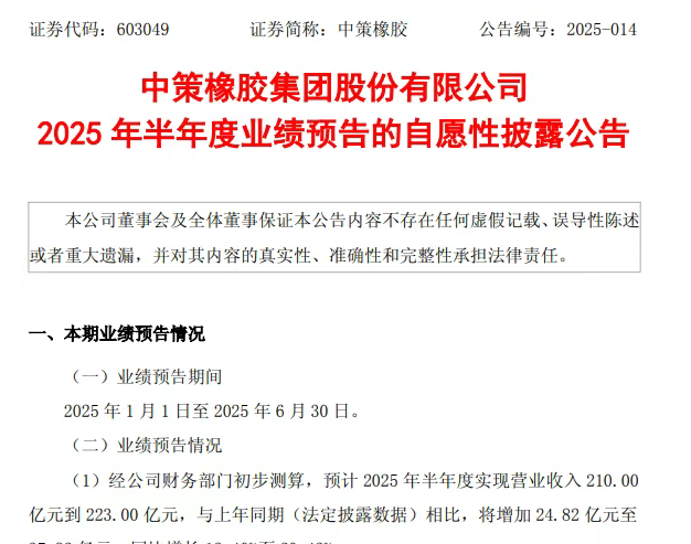 【炭黑產(chǎn)業(yè)網(wǎng)】7月5日消息,近日,國(guó)內(nèi)輪胎行業(yè)龍頭企業(yè)中策橡膠集團(tuán)股份有限公司(股票代碼:603049)發(fā)布2025年半年度業(yè)績(jī)預(yù)告,在復(fù)雜多變的全球經(jīng)濟(jì)環(huán)境下交出了一份逆勢(shì)上揚(yáng)的成績(jī)單。數(shù)據(jù)顯示,公司預(yù)計(jì)上半年實(shí)現(xiàn)營(yíng)業(yè)收入210億至223億元,同比增長(zhǎng)13.40%-20.42%;扣除非經(jīng)常性損益后的凈利潤(rùn)達(dá)21.80億至23.20億元,同比增長(zhǎng)1.68%-8.21%。這一表現(xiàn)不僅遠(yuǎn)超行業(yè)平均水平,更印證了其作為全球輪胎制造商的抗風(fēng)險(xiǎn)能力與市場(chǎng)競(jìng)爭(zhēng)力。